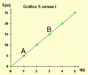 Inclinação da reta = ( SB - SA)/(tB - tA) = (15 - 5) m / (3 - 1) s = (10 m) / (2 s) = 5 m/s
